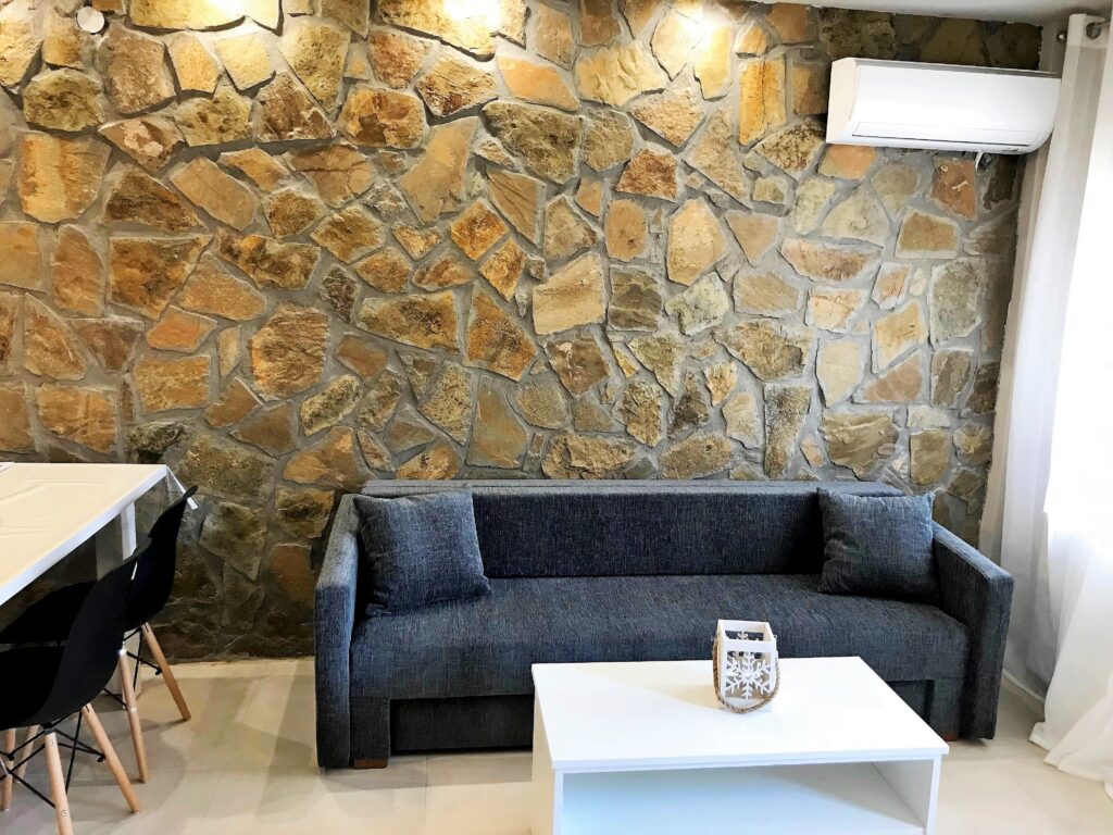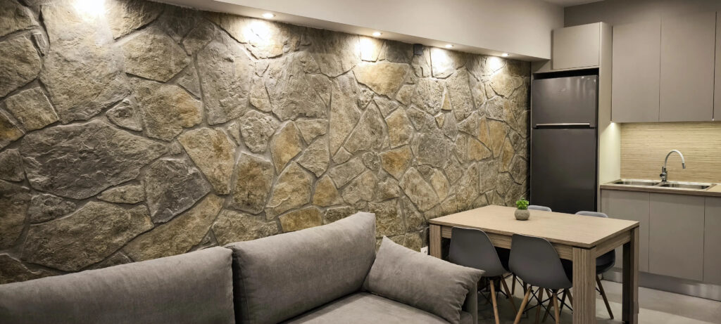 Η επένδυση τοίχου με Λημνιά πέτρα στο σαλόνι, προσδίδει ένα μοναδικό πάντρεμα το μοντέρνου με το παραδαοσιακό. Σε συδυασμό με την προσεγμένη διακόσμηση έρχεται ένα μοναδικό αποτέλεσμα.
